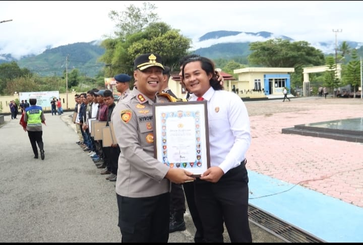 Blangkejeren, 16 Februari 2026 |  Kapolres Polres Gayo Lues AKBP Hyrowo, S.I.K., memimpin langsung upacara penyerahan penghargaan kepada personel Polres Gayo Lues yang dinilai berdedikasi tinggi dalam penanganan bencana hidrometeorologi di wilayah Kabupaten Gayo Lues. Kegiatan tersebut berlangsung pada Senin (16/2) sekira pukul 09.00 WIB di Lapangan Apel Polres Gayo Lues dan berakhir pukul 10.00 WIB dalam keadaan aman dan tertib.
